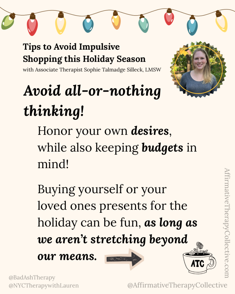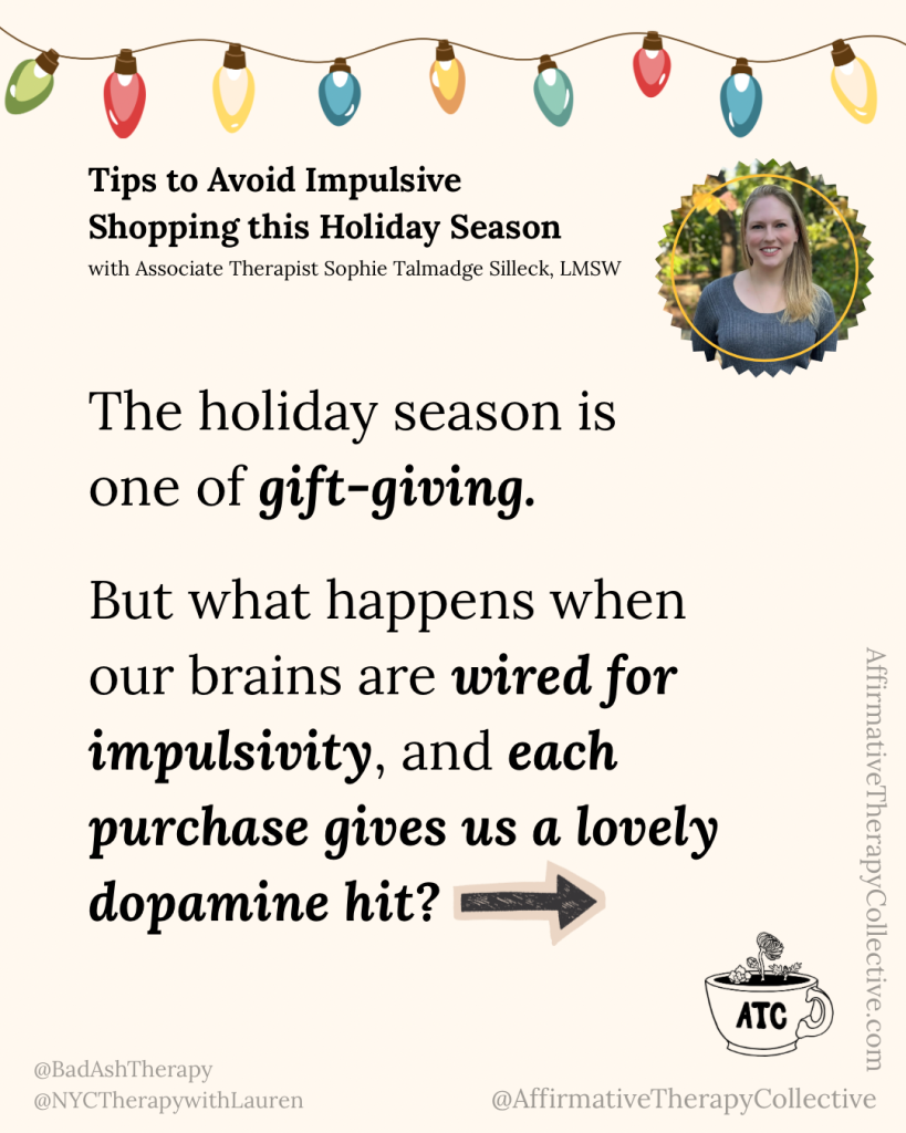 The holiday season is one of gift-giving. But what happens when our brains are wired for impulsivity, and each purchase gives us a lovely dopamine hit? Join Sophie Talmadge Silleck, LMSW in exploring the common pitfalls for impulsive people while shopping for the holidays.