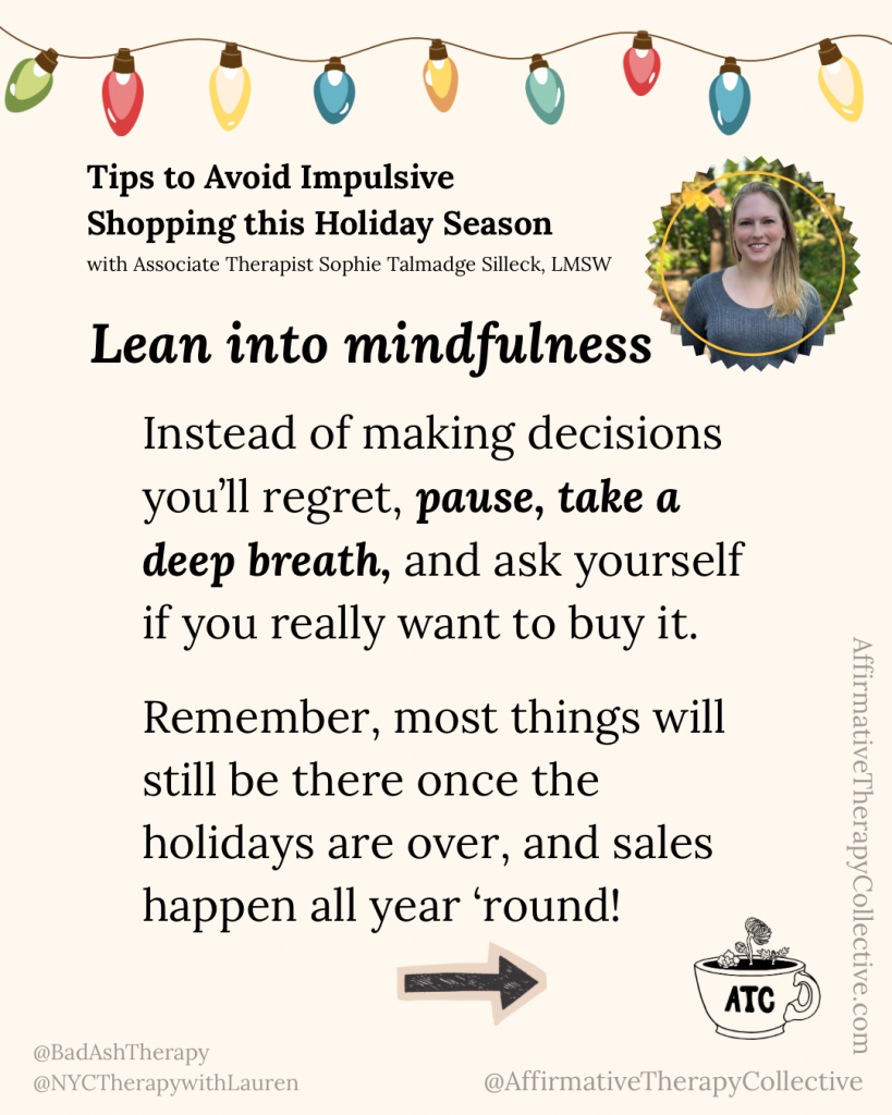Staying mindful while shopping during the holiday season is so important. If you see something you really want, put it on the wish list and decide later. You don’t need to be impulsive and buy just because it’s right in front of you. It will most likely be there a few days later if you still want it. There’s also no need to buy a million things for one person… one or two really thoughtful gifts go a really long way! Instead of making decisions you’ll regret, pause, take a deep breath, and ask yourself if you really want to buy it.