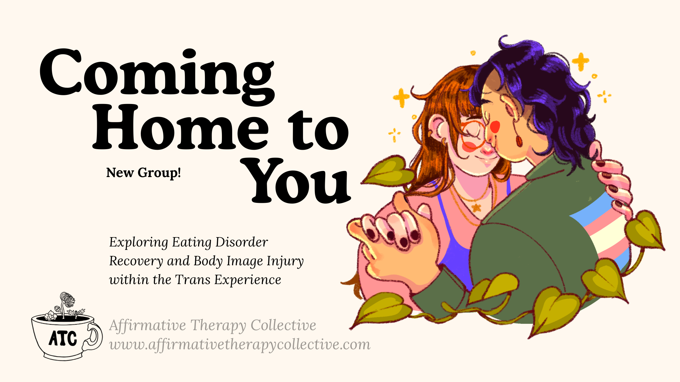 A new group offering a space for adult trans folks (binary trans individuals as well as non-binary folks, 18+) struggling with disordered eating, eating disorders, and body image! Facilitated by ATC associate Sophie Kuhn Bedaña, LMSW, this group is built as a space to explore the unique intersections and challenges of the trans body experience with eating and body image disruptions.