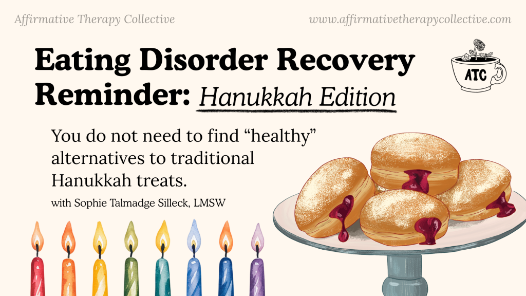 Hanukkah is a special holiday that reminds us to stand up for ourselves, celebrate the light in the dark, and find joy where we can. So stand up to diet culture and eat the food you want to eat! Enjoy the holiday and the delicious food that goes with it, without guilt or judgment.